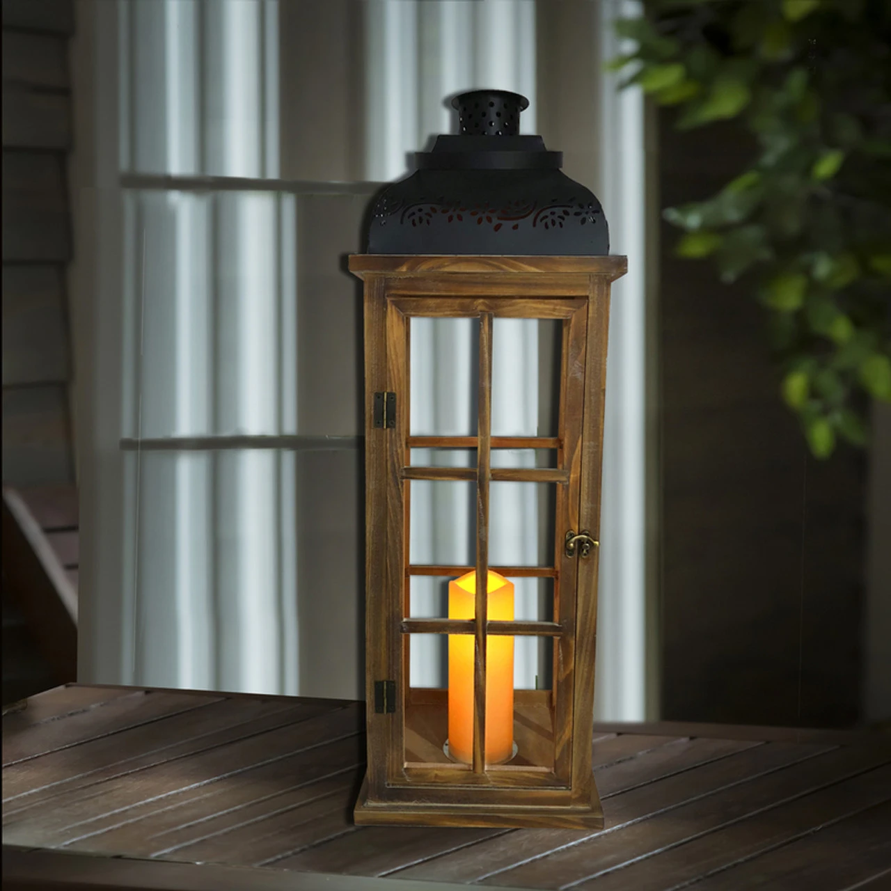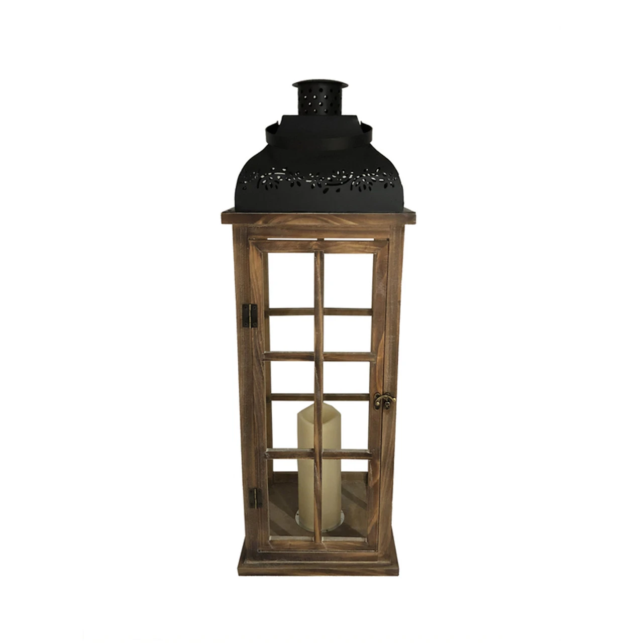 Lanterns are the perfect accent piece to decorate any outdoor space. This wood and metal lantern with candle is 29 in. and will make a statement on its own or with its companion sizes (sold separately).