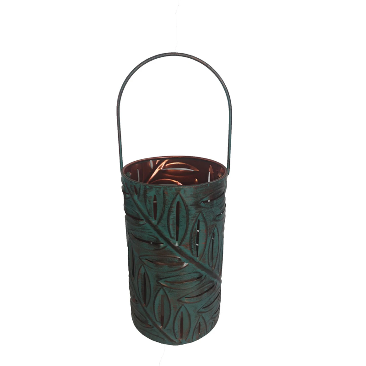 Unique metal lantern with handle. Lantern features fern leaves cut into the metal in a very artistist design. The LED candle will add ambience to your patio, deck, sunroom, porch, or even indoors. Lovely patina color.