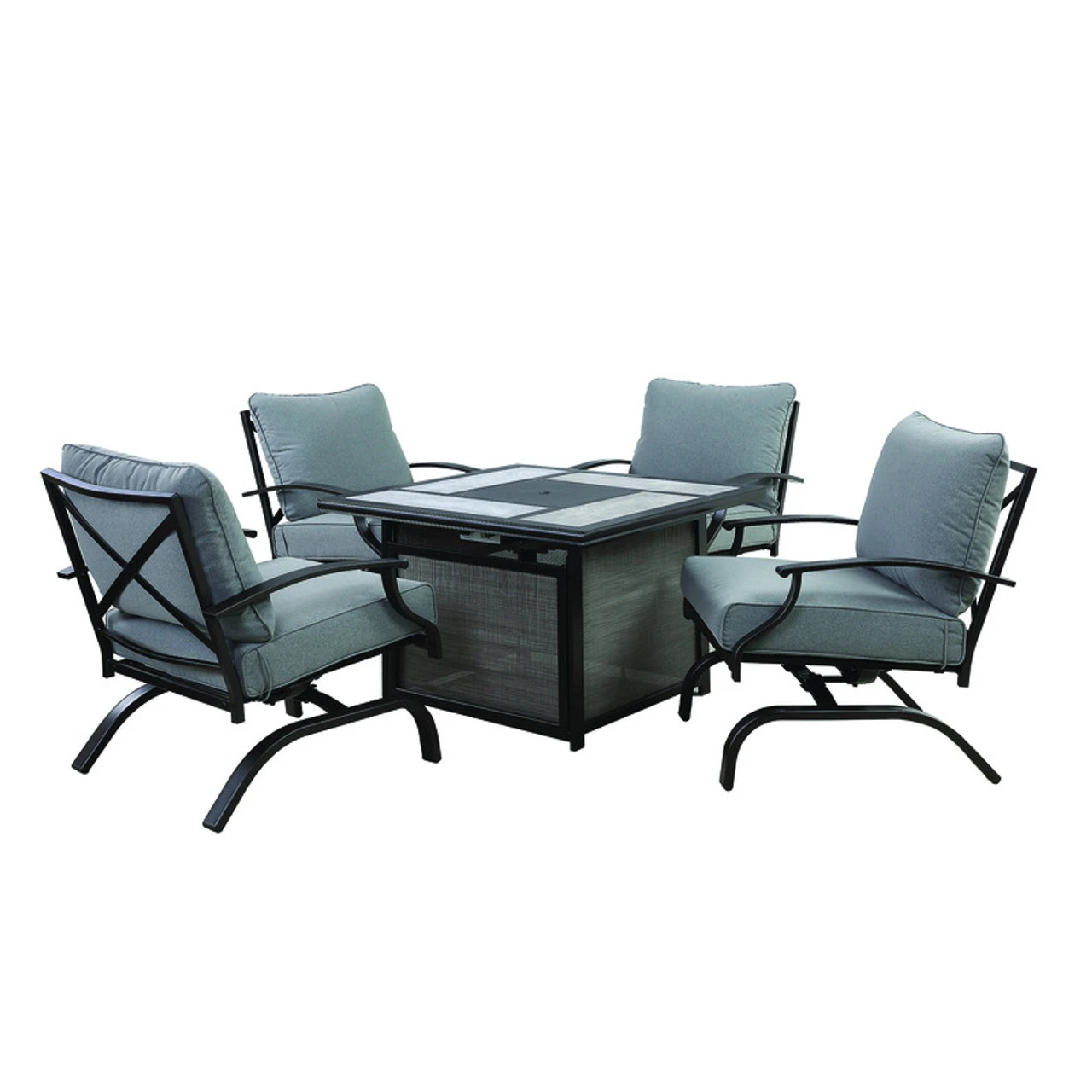 Canzo is the ideal gathering spot for all seasons. This classic collection comes with 4 steel motion chairs covered in gray olefin cushions featuring a unique X back design. The 37,000 BTU fire pit table topped with tile includes lava rock and internal tank storage.