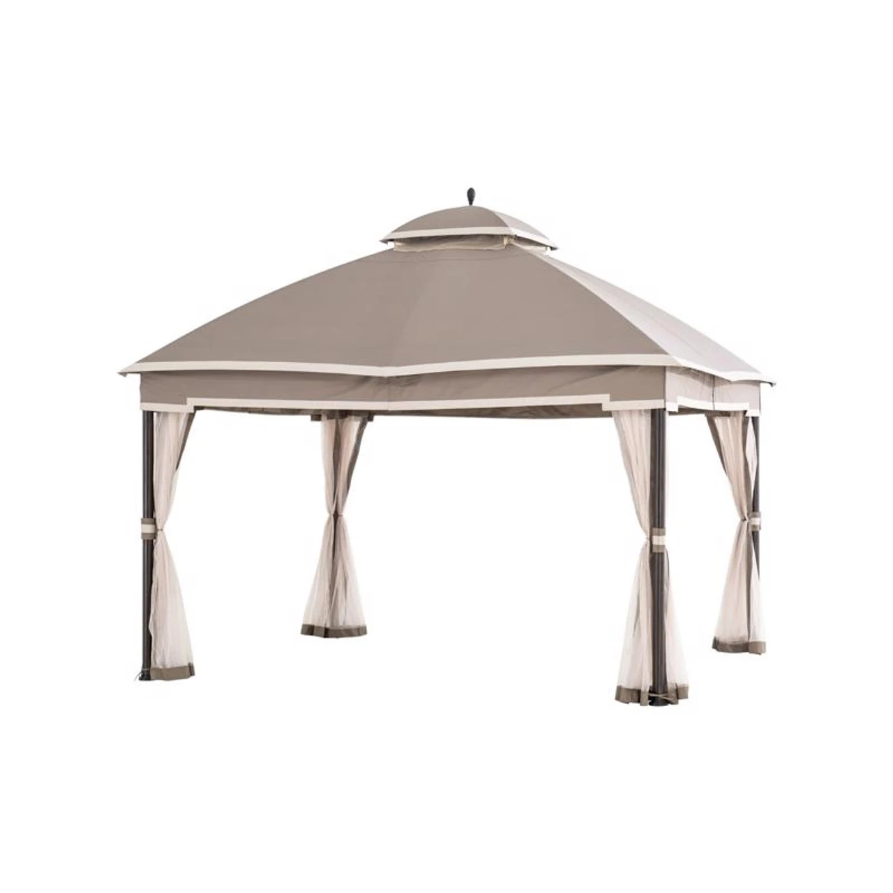 Elegant soft top canopy with gently curved dome roofline, complementing any outdoor space. Substantial corner posts with dark brown powder coated finish. Fully outfitted with expertly tailored fabric curtain panels, mosquito netting panels and tie back bands.