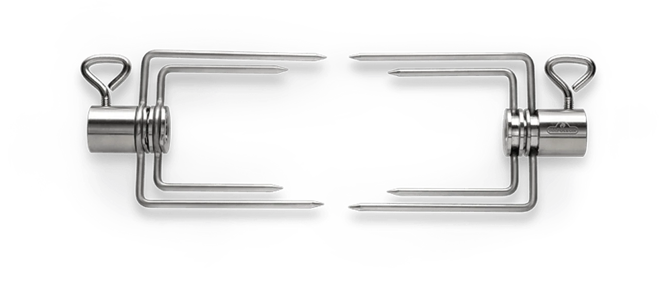 Using a rotisserie to create meals on the barbecue is easy and delicious, but sometimes you need a little extra help. This set of two Rotisserie Forks is happy to help. Featuring four prongs for easy gripping of food without damage and a collapsable design for easy storage, you won’t know what you did before you had these extra hands. The food0-grade stainless steel is dishwasher safe and they are universal, fitting both square and hexagonal spit rods easily.