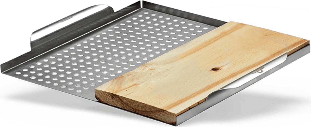 This Stainless Steel Multi-Functional Grill Topper with Cedar Plank by Napoleon is designed for your grilling needs. The perforated side makes grilling vegetables a breeze, preventing your veg from falling through the grids while they get that great grilled flavor. The flat side of the Stainless Steel Multi-Functional Grill Topper is perfect for searing delicious foods, like scallops. The flat side also doubles as a holder for the included cedar plank so you never have to worry about lighting another plank on fire. Stainless steel construction makes this grill accessory durable and easy to clean. It’s up for any food you want to throw on it. You can easily place and remove the Stainless Steel Multi-Functional Grill Topper on the grill with the built-in handles. Just remember to wear heat resistant gloves when it’s hot. Expand the possibilities of your grill with the Napoleon Stainless Steel Multi-Functional Grill Topper.