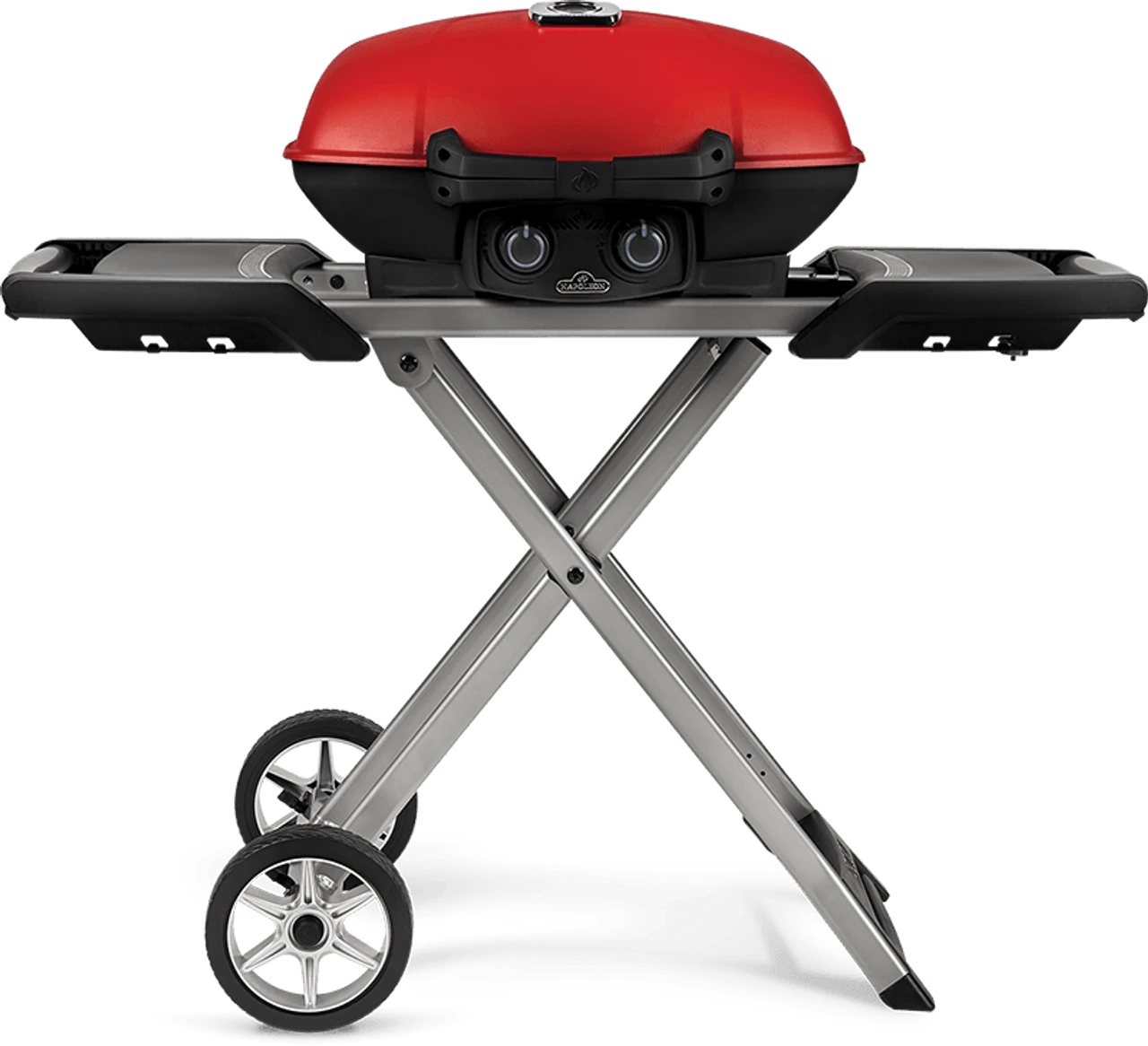 The beautiful red Napoleon TravelQ™ 285X Portable Propane Gas Grill with Scissor Cart is a grill that is leading the way with innovation and quality. Napoleon’s TravelQ™ 285X has everything you need for perfect portable grilling anywhere. Featuring all-terrain wheels, easy folding, setup, and compact storage. Two burners provide precise heat for indirect grilling and smoking, or high heat searing and is ideal for cooking small chickens or roasts thanks to a high-top cast aluminum lid. You’ll know it’s a Napoleon with the iconic WAVE™ cooking grids for those distinctive sear marks. The porcelain coated cast iron cooking grids and griddle season up just like a cast iron frying pan. Go anywhere by hooking up a 1.2 lb. propane cylinder, or stay put with a full-sized tank. The TravelQ™ 285X has everything you need for successful grilling on the go. Winner of two prestigious awards, the 2014 Vesta in the gas barbecue division, and the award for Top Ten Best Value Grill from AmazingRibs.com.