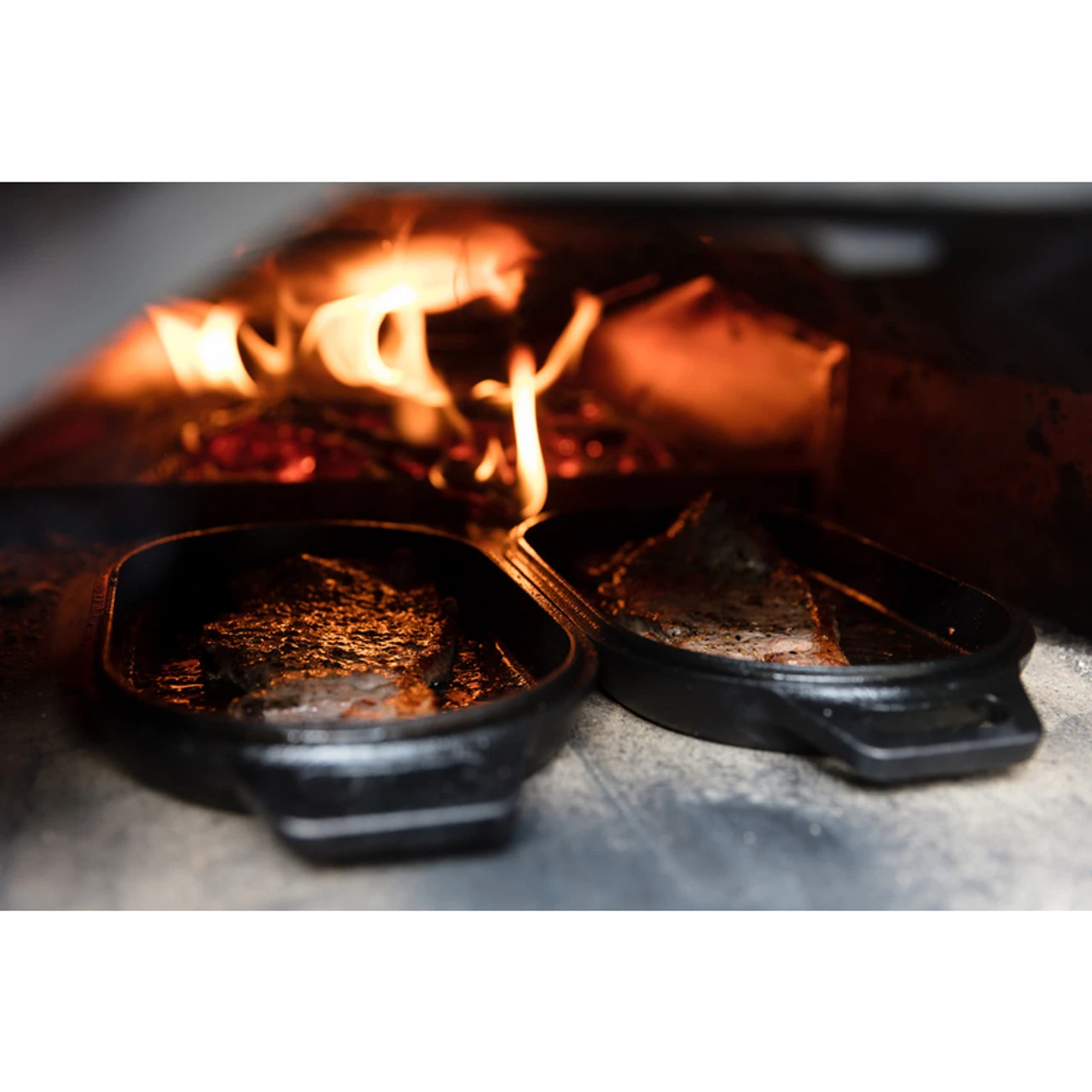 This premium cast iron pan brings together the versatility of the Sizzler pan with the distinctive mouth-watering grill marks you can only get from a griddle pan because after all, the first bite is with the eye. Meats and veggies seared on the Ooni Grizzler are out of this world. The Grizzler comes with a custom-designed removable cast iron handle allowing easy loading in and out of your Ooni ovens and a sustainably sourced beech wood serving board for serving.