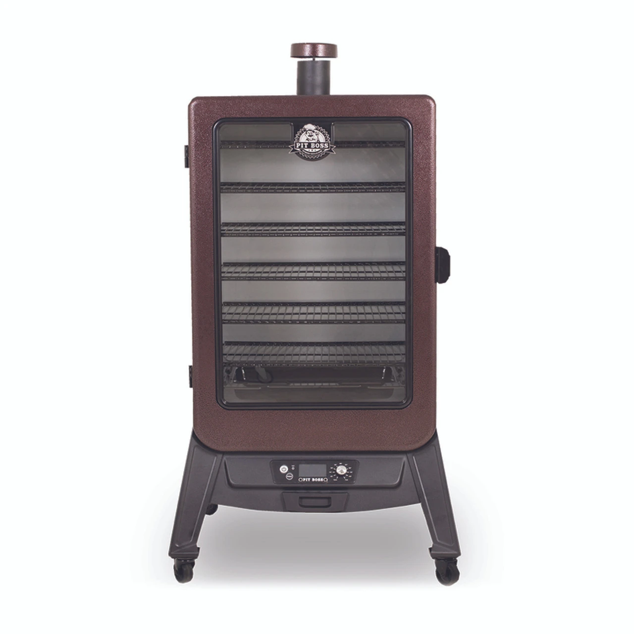Innovation meets the outdoors with Pit Bos’s all new 7 Series Vertical Pellet Smoker. Never has smoking been this versatile. The double walled insulation lets you smoke from 100°F to temperatures reaching 420°F, unlike any other smoker on the market today. The large front window eliminates the need for peek-a-boo cooking and its elevated frame makes transferring your meal from the smoker to the table a breeze. With the PB 7 Series Pellet Smoker there is no need to fret about cooking length’sits 55 pound plus hopper allows you to cook for up to 24 hours! Its sleek design is not only unique, it is also functional. The 7 Series Pellet Smoker features 1,853 square inches of porcelain coated cooking racks, locking caster wheels, an easy to read digital controller, and notable hammer tone copper finish. The multiple position racking system ensures you’ll have enough room to smoke anything your heart (or stomach) desires. Experience how Pit Boss is redefining the smoker industry in your own backyard! Includes the Pit Boss best-in-class 5-year warranty.