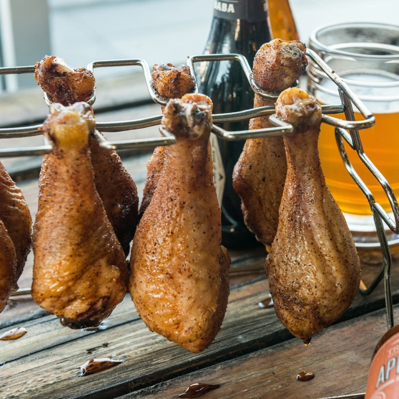 The benefits of hanging your chicken legs are many even roasting and smoke penetration, self-basting and full utilization of grill space. Traeger grills move the heat, not the meat. The internal fan circulates heat and smoke evenly throughout the grill, infusing food with rich, robust flavor. The Chicken Leg Hanger complements the convection process and helps you get the most from your Traeger when you Grill, Smoke, Bake, Roast, Braise and BBQ.